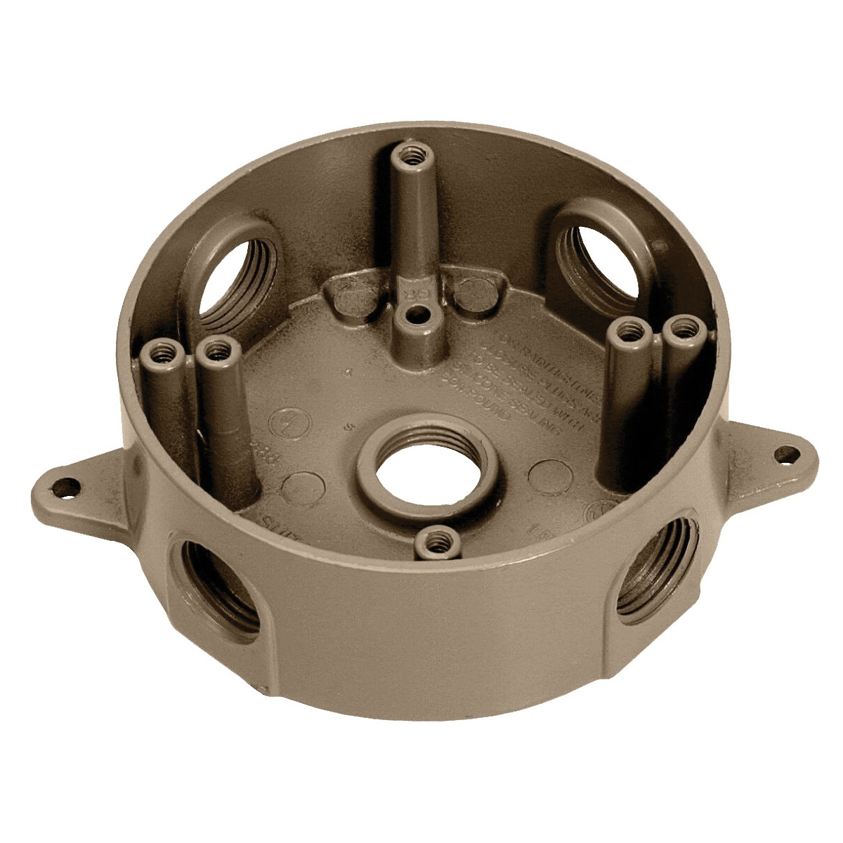 Teddico/Bwf Outlet Box, 1/2 in Hub, 5 Knockouts, 5-1/2 in Knockout, Round Shape, 117.3 cu-in, Dimensions: 4-9/16 in L x 4-5/8 in W, Metal, Bronze, Powder-Coated, Includes: Closure Plugs, Ground Screw and Mounting Lugs