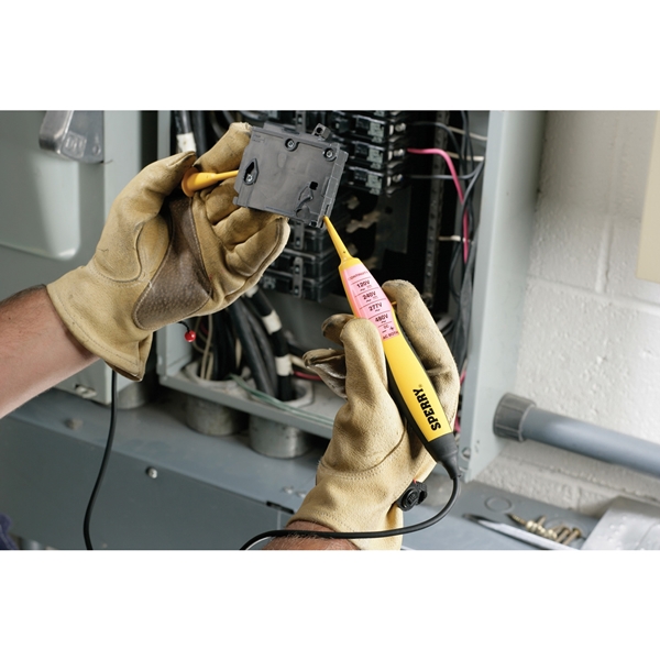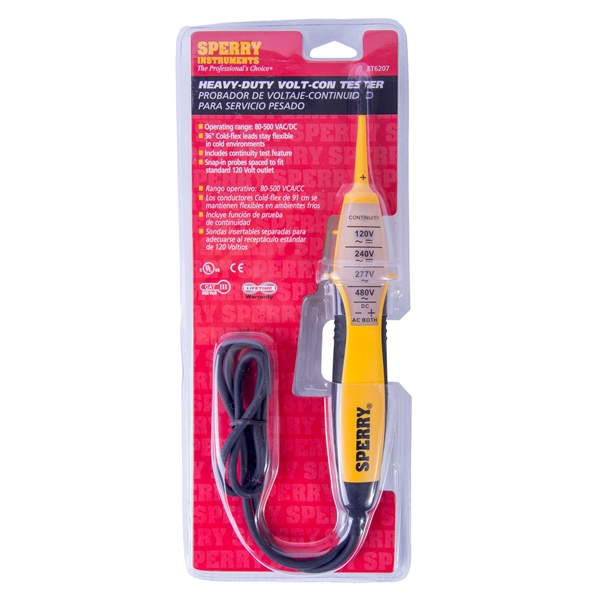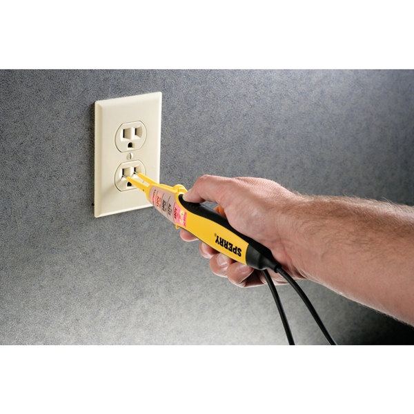 Heavy-duty voltage and continuity tester designed for any number of jobsite applications. Sperry Instruments unique design allows for convenient single hand testing of outlets when the probes are secured side-by-side on the tester housing. Just insert the probes into the outlet and if voltage is present the neon indicators will glow.