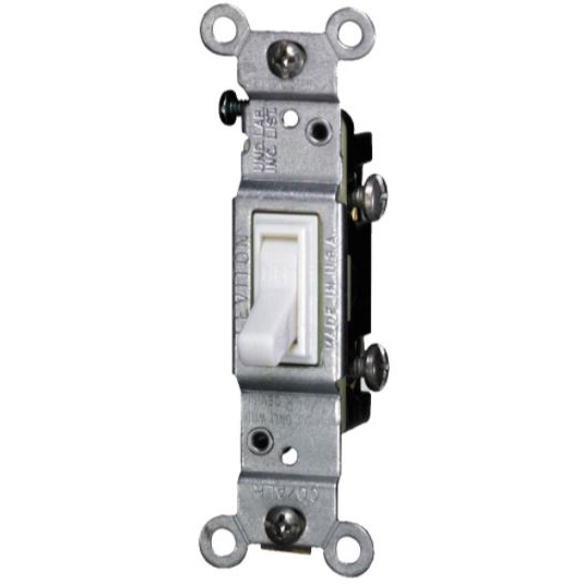Leviton Toggle Switch, 120 V, 15 A, 0.5 hp Wattage, 1 Pole, Quiet Actuator, Screw Mounting, Thermoplastic Housing Material, White, Dimensions: 4.2 in L x 1.31 in W x 1.01 in D