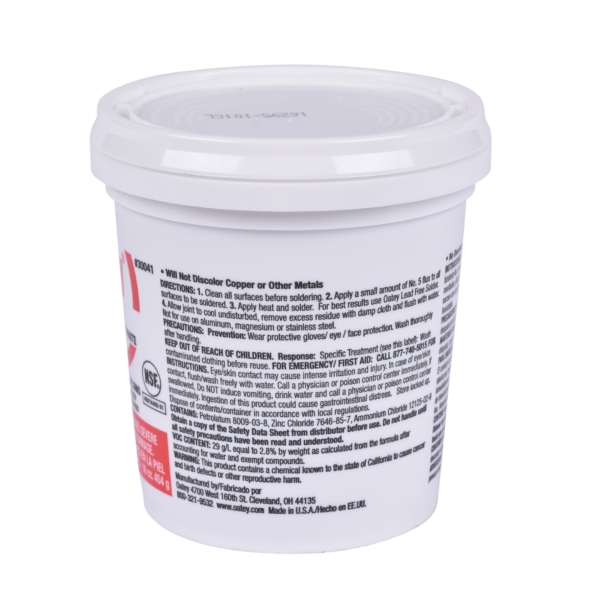 Oatey® #5 paste flux is a petrolatum-based flux designed to provide superior wetting properties for better solder flow. It can be used with most soft solders.