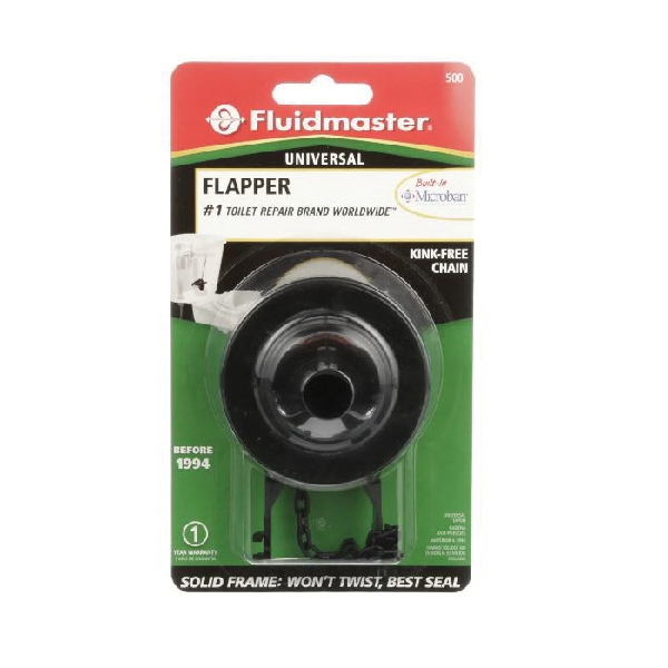 The Fluidmaster® 500 universal 2 in toilet flapper features a solid frame design, to resist bending or twisting and secure the best seal with every flush. Eliminate having to jiggle the toilet handle with this universal design that fits most 2 in flush valve toilets. Includes a 1 year warranty and built-in Microban® technology. Only Fluidmaster® has toilet flappers with built-in Microban® protection. Not just simply a coating, Microban® is specifically built into the construction of our flappers to fight flapper breakdown and combat bacteria.
