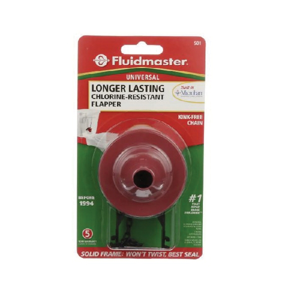 The Fluidmaster® 501 universal chlorine-resistant toilet flapper is designed to be a longer lasting and high-quality flapper replacement, to fit most 2 in flush valves. Built tough to last in any water condition, with chlorine-resistant materials and built-in Microban®. Only Fluidmaster® has toilet flappers with built-in Microban® protection. Not just simply a coating, Microban® is specifically built into the construction of our flappers to fight flapper breakdown and combat bacteria. The solid frame ensures a secure seal, by resisting bending or twisting during flushing, so you never have to jiggle the toilet handle again.