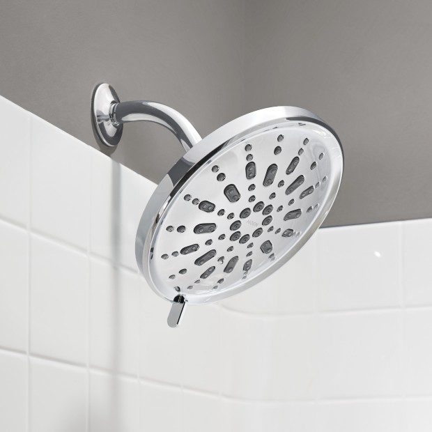 The five-function, transitionally styled Enthrall™ rain shower provides all-over water coverage for the ultimate showering experience. A simple shift of the dial offers the choice of five spray options ranging from deep massage to concentrated rinse.