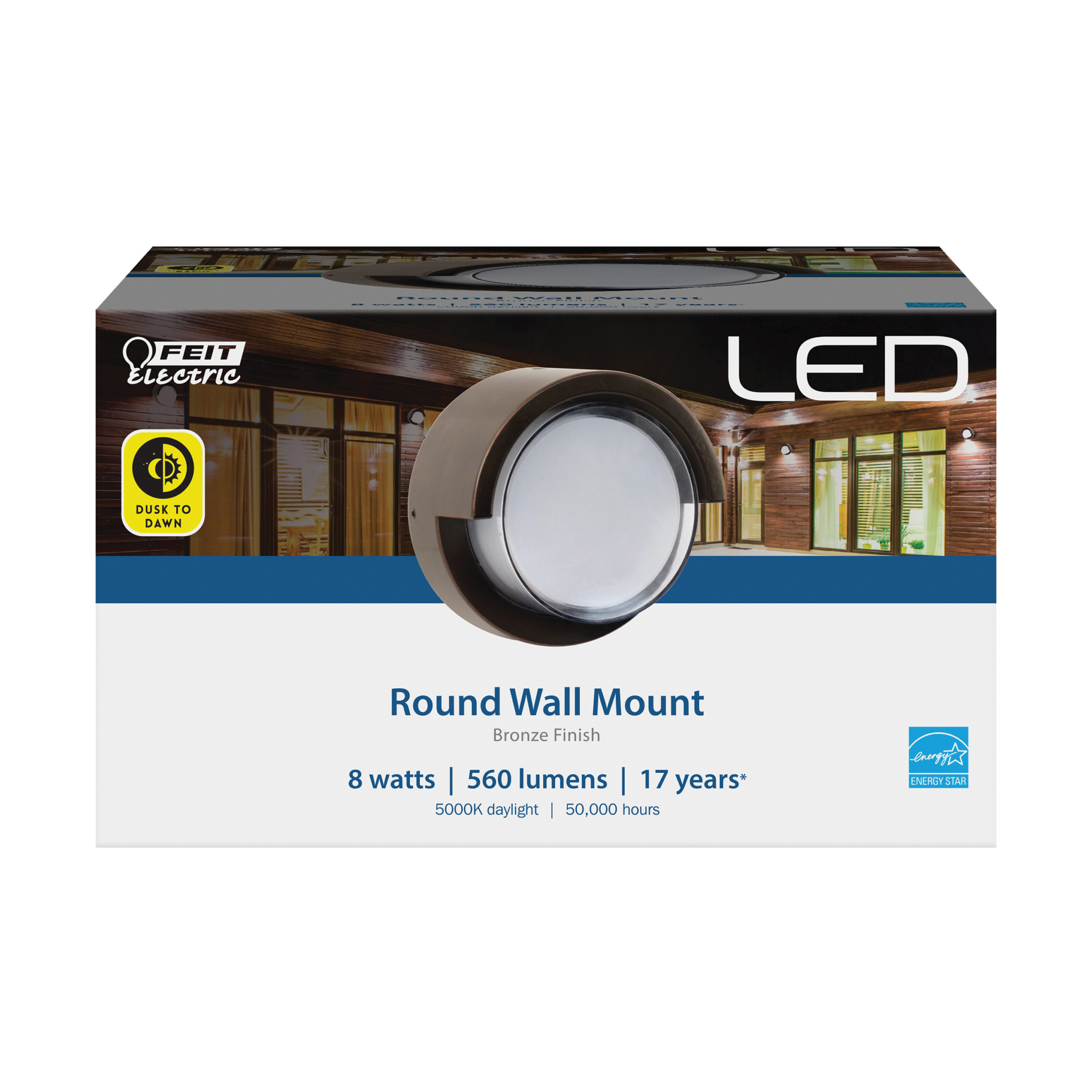 All the advantages of advanced LED energy-saving technology and high-performance exterior security lighting meets timeless style with this beautiful outdoor round S5RWM/850/DD/BZ wall light. This collection features a contemporary yet casual design with a solid bronze finish that complements the exterior decor of any home and turns on at dusk and off at dawn for added convenience and energy savings. The sturdy, heavy-duty rust-proof aluminum construction along with high-quality polycarbonate lens provides enhanced durability to ensure the long life of the fixture. These outdoor lights install easily and deliver welcoming, safe and reliable exterior lighting.