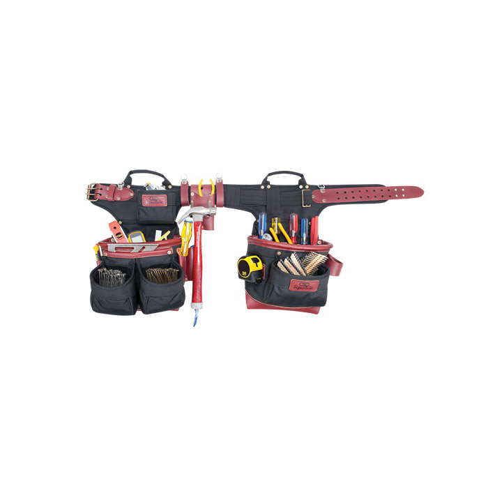 This pro framer's adjustable tool apron is our ultimate line of work gear, made with double layered ballistic nylon fabric and heavy-duty top grain premium leather with a double tongue roller buckle belt, our easy carry pouches with 19 pockets and sleeves for your favorite nails and tools.
