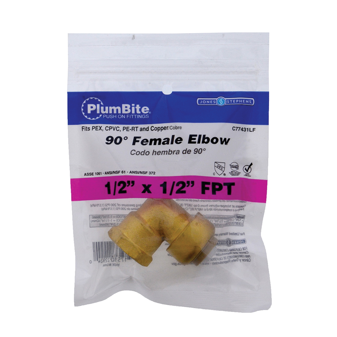 Jones Stephens PlumBite C77431LF Pipe Elbow Adapter, 1/2 in, FPT, 90 deg Angle, Brass, 200 psi
