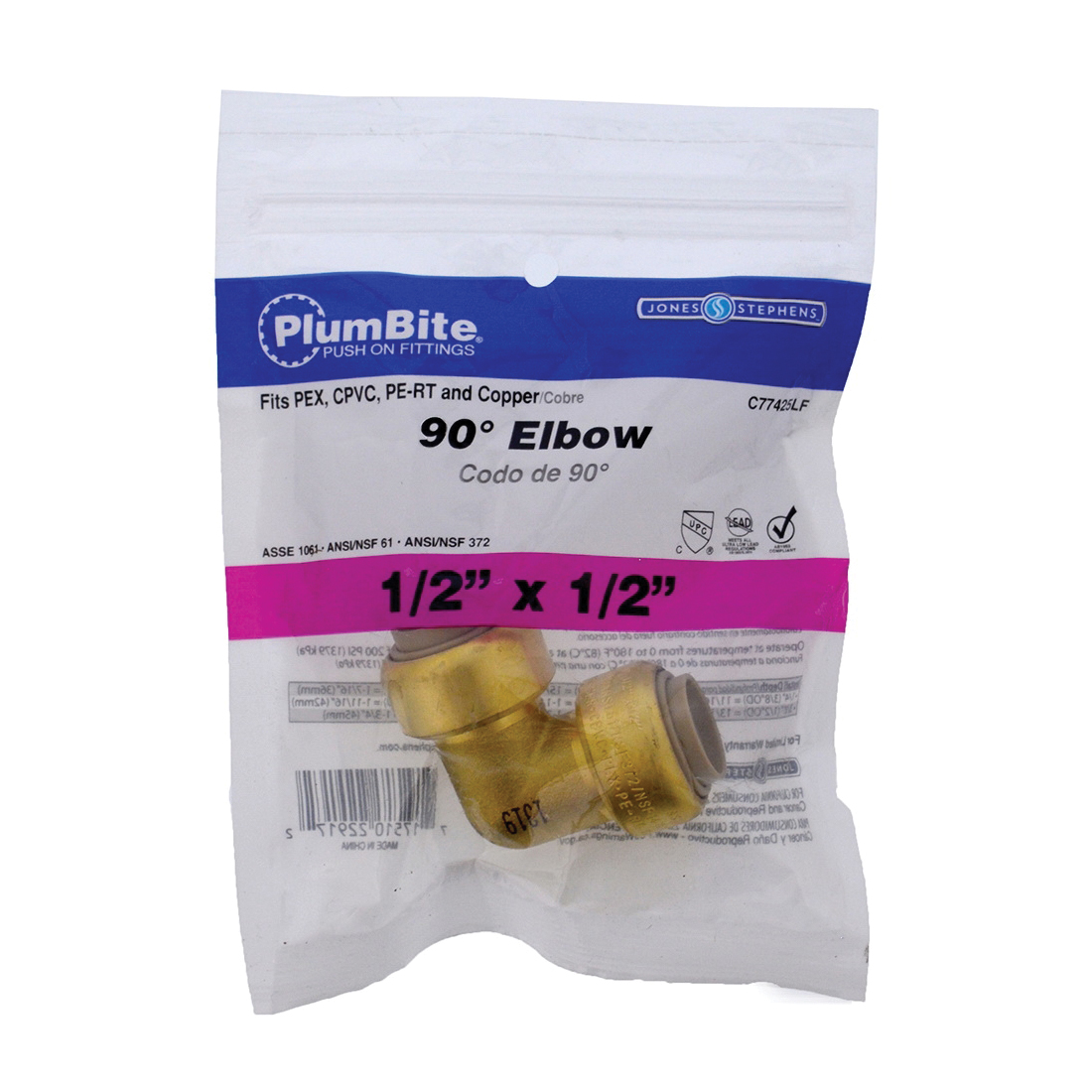 Jones Stephens PlumBite C77425LF Pipe Elbow, 1/2 in, 90 deg Angle, Brass, 200 psi Pressure