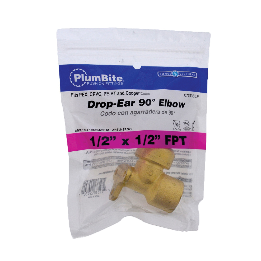 Jones Stephens PlumBite C77436LF Drop Ear Pipe Elbow, 1/2 in, 90 deg Angle, Brass, 200 psi Pressure