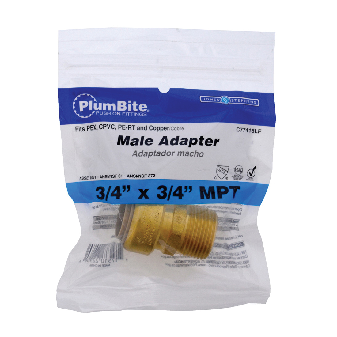 Jones Stephens PlumBite C77418LF Adapter, 3/4 in, Push-On x MPT, Brass, 200 psi Pressure