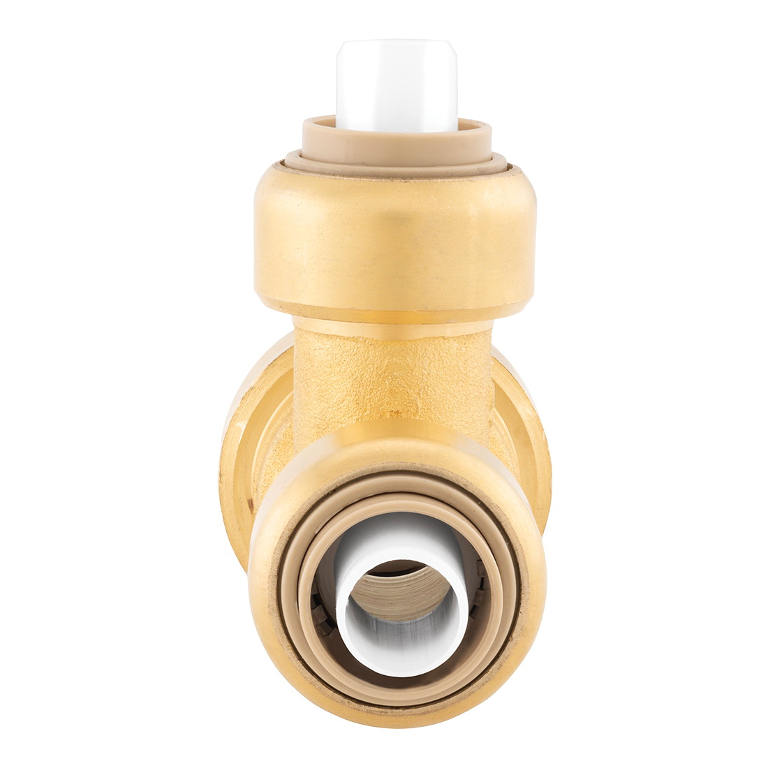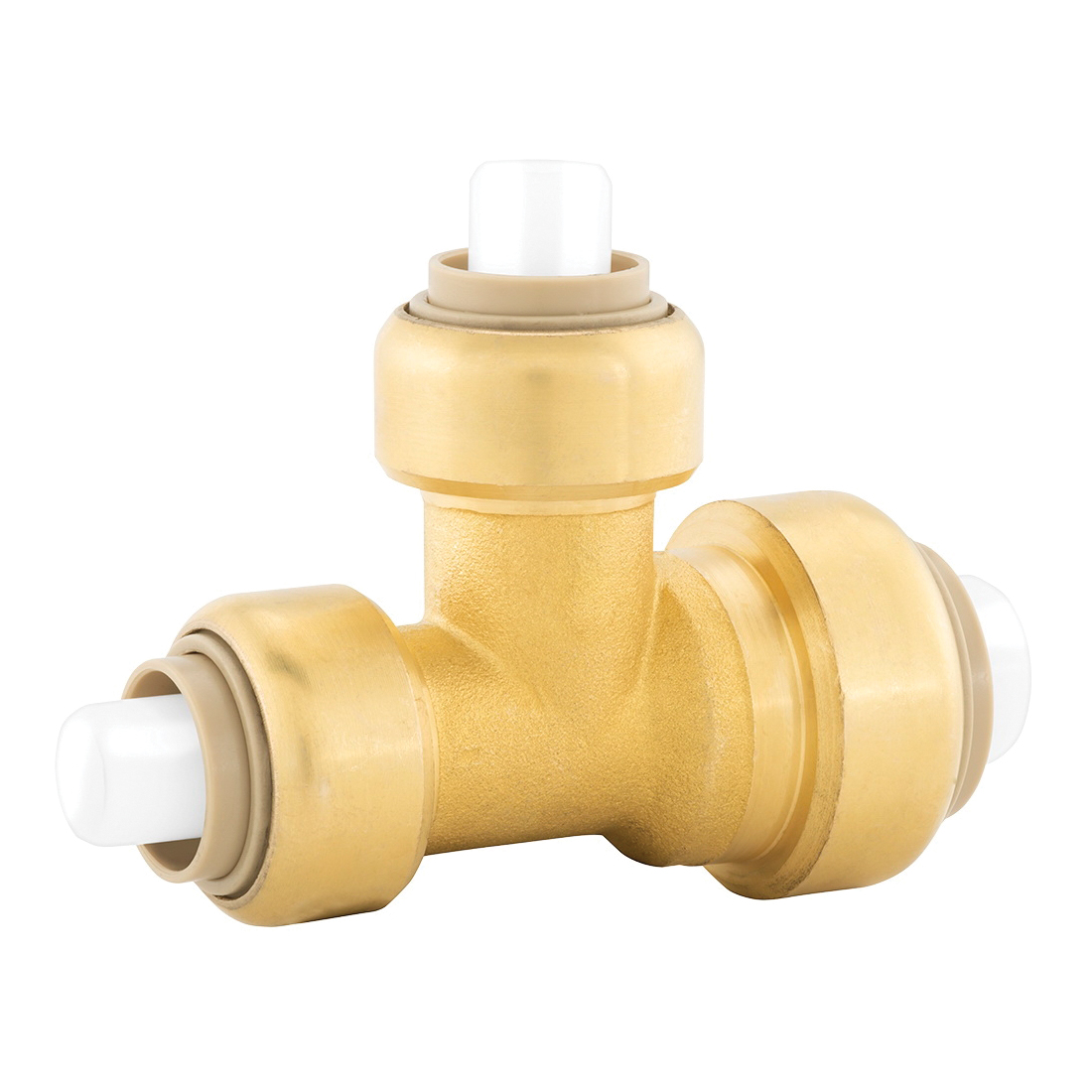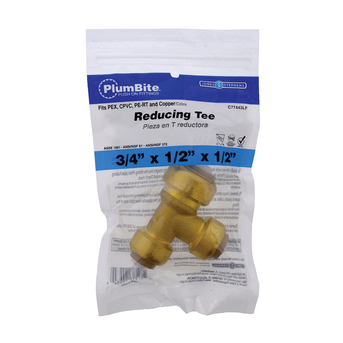 • Jones Stephens PlumBite C77443LF Reducing Pipe Tee, 3/4 x 1/2 x 1/2 in, Push-Fit, Brass, 200 psi Pressure