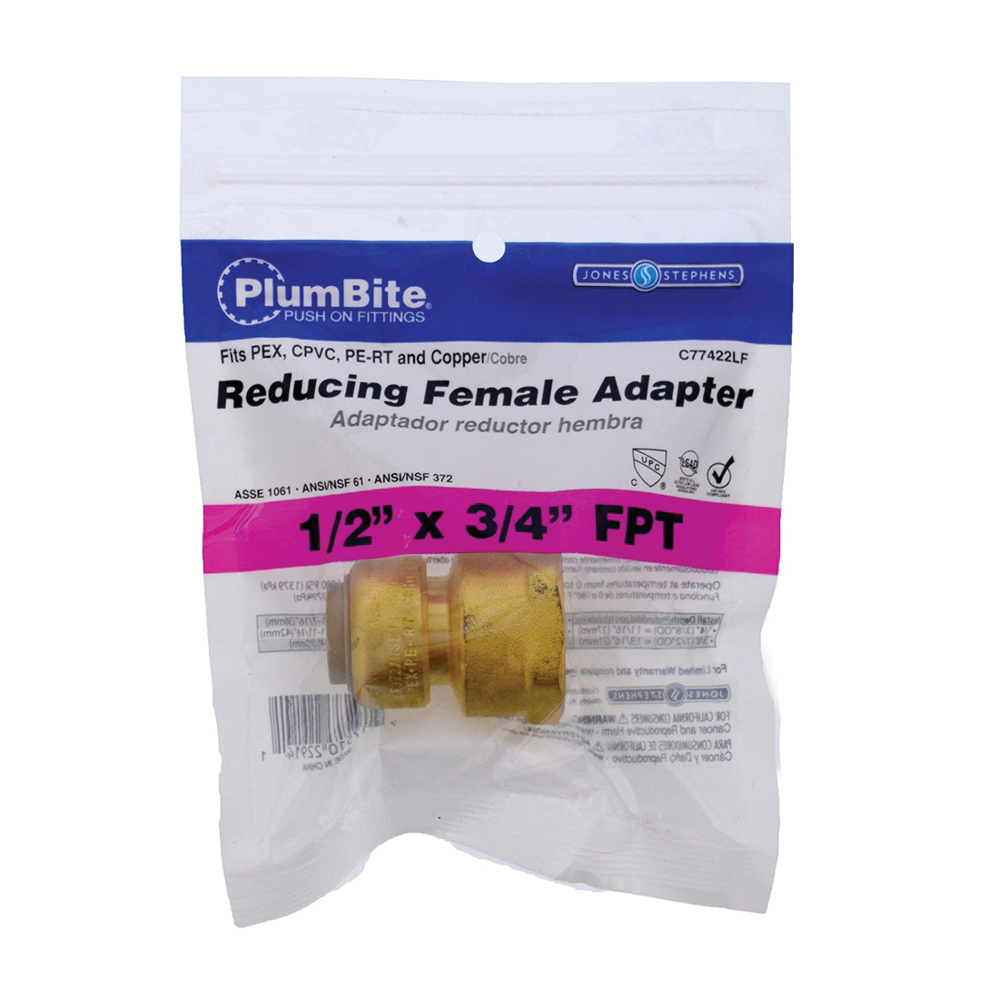• Jones Stephens PlumBite C77422LF Reducing Adapter, 1/2 x 3/4 in, Push-On x FPT, Brass, 200 psi Pressure