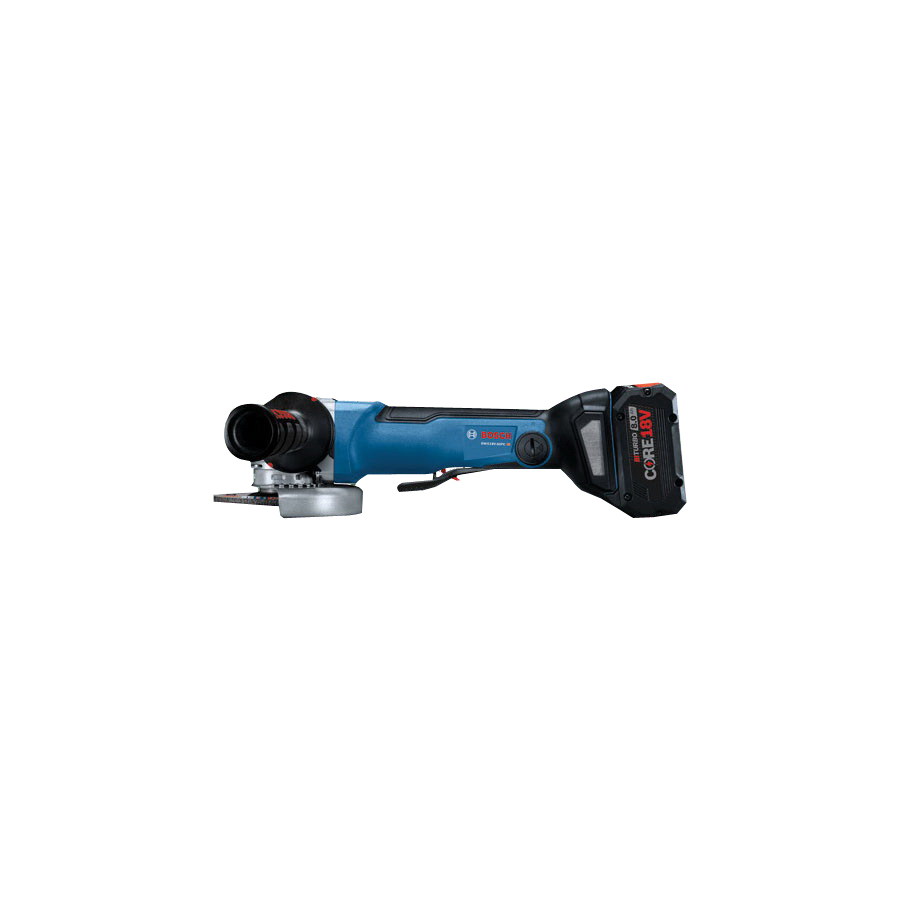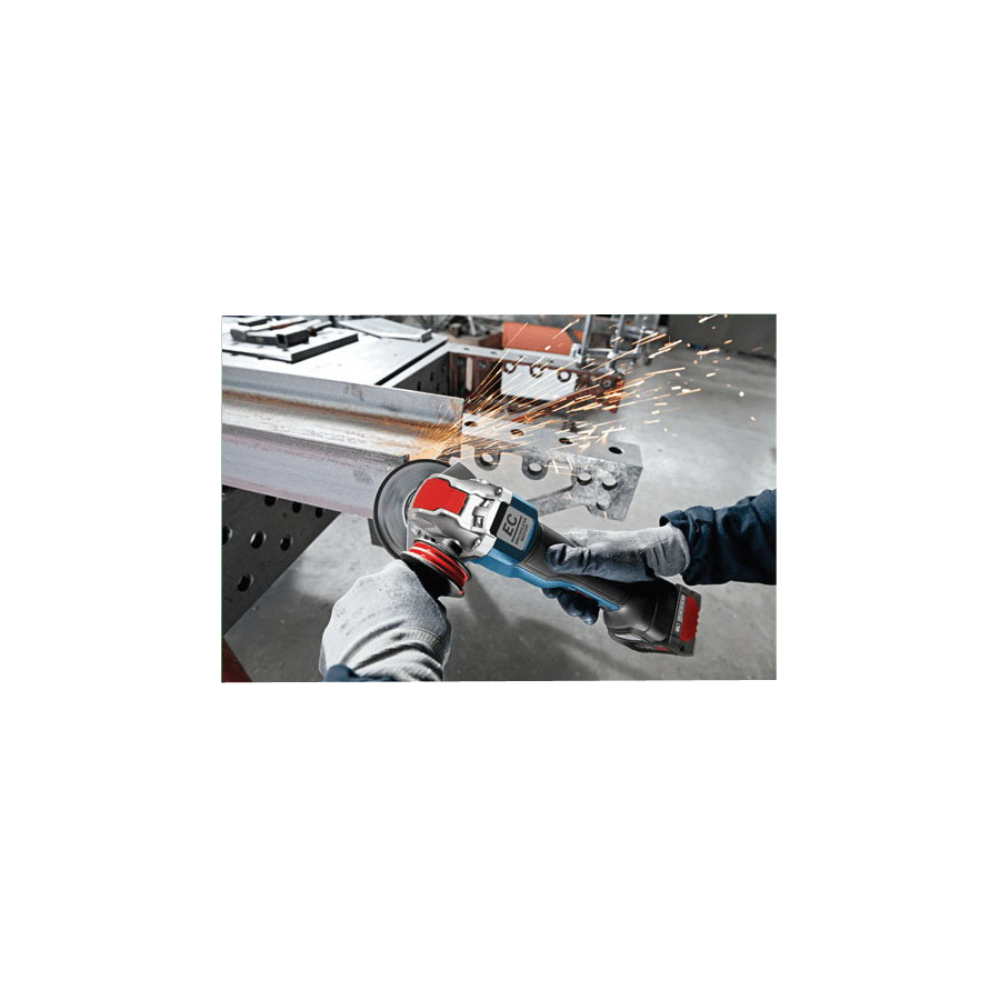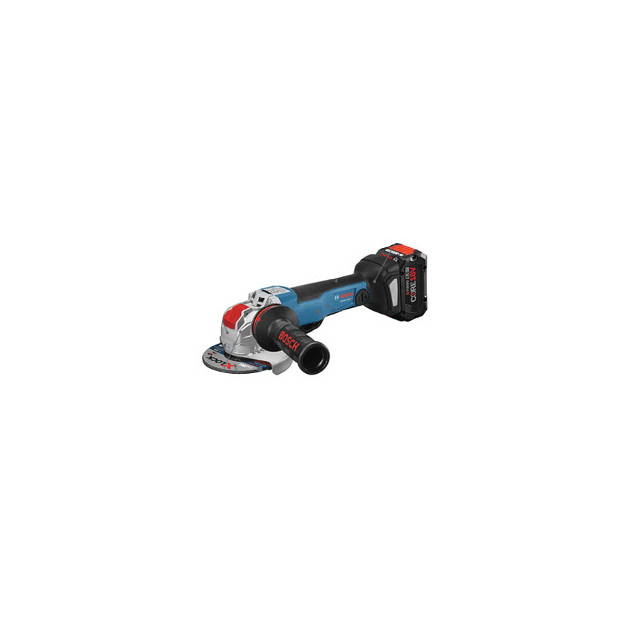 The Bosch GWX18V-50PCN 18 V EC brushless connected-ready 4-1/2 to 5 in angle grinder features the X-LOCK mount, offering a wheel change interface that's up to 5X faster than conventional interfaces. There's an audible snap when mounting an X-LOCK wheel on an X-LOCK grinder. The wheel mounts properly without the need for a spanner wrench or flange nuts. The wheel is released from the grinder with the pull of a lever. The grinder's EC brushless provides greater efficiency that maximizes runtime and productivity. The grinder provides an X-Brake, which helps provide a rapid stop of the wheel when the switch is turned off. It also includes other advanced electronics, such as drop control, kickback control, restart protection and soft-start technology. The grinder has connected-ready capability, supplying an interface that works with the optional Bosch connected tool module to link to the free Bosch toolbox app and to the blue hound system.