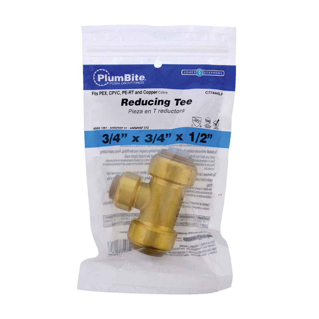 Jones Stephens PlumBite C77444LF Reducing Pipe Tee, 3/4 x 3/4 x 1/2 in, Push-Fit, Brass, 200 psi Pressure