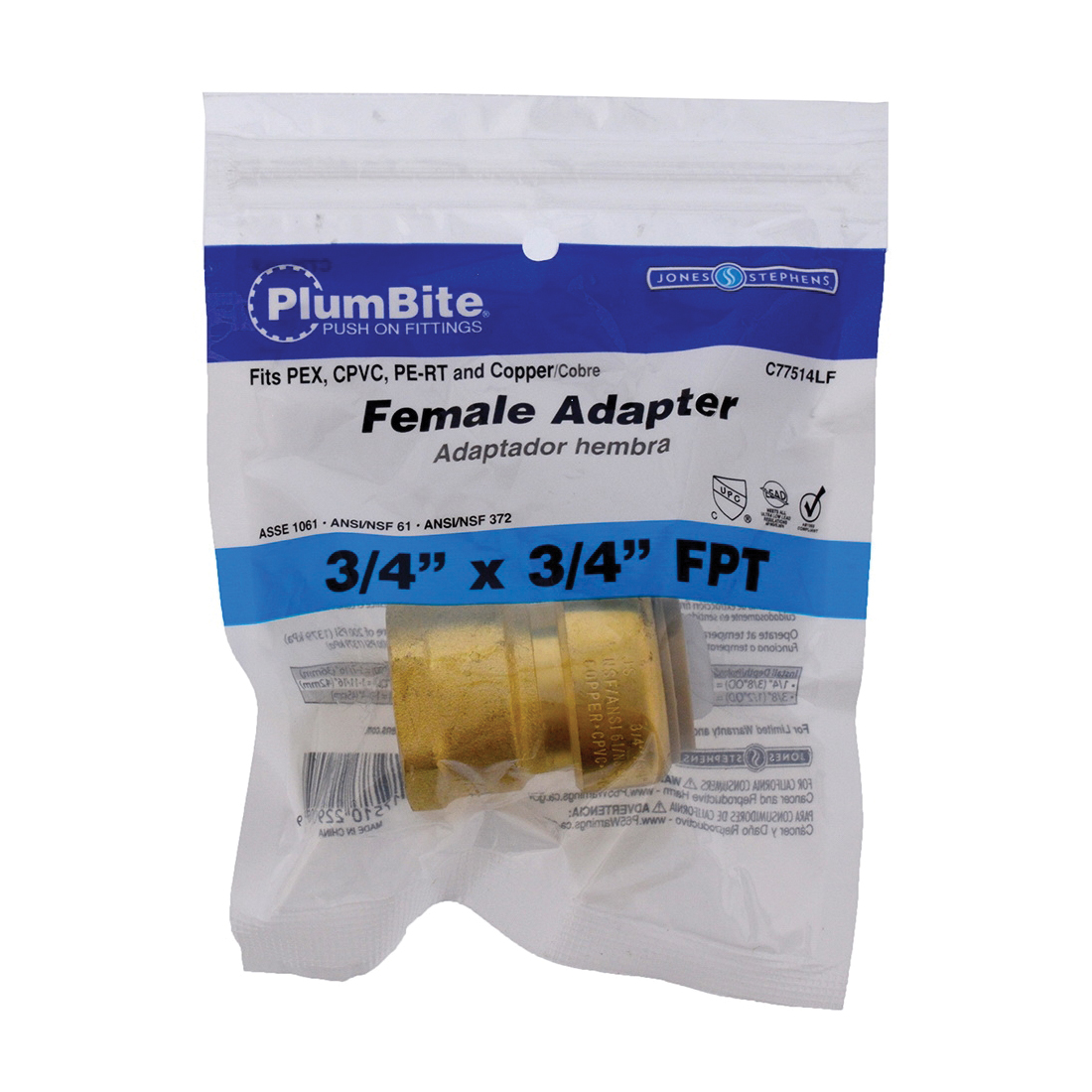 Jones Stephens PlumBite C77514LF Adapter, 3/4 in, Push-On x FPT, Brass, 200 psi Pressure