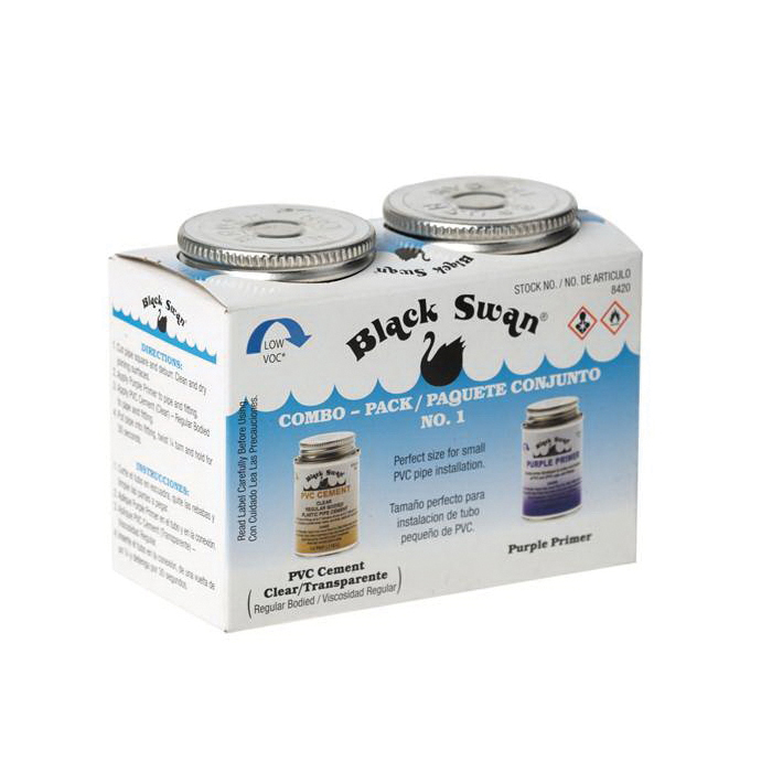 Combo pack no. 1 is a combo pack that contains one 0.25 pt can of PVC cement (clear) regular bodied and one 0.25 pt can of purple primer. Both products are low VOC. This is an ideal quantity of cement and primer for small jobs. Please see product page for PVC cement (clear) regular bodied in category 7 and product page for purple primer in category 8.