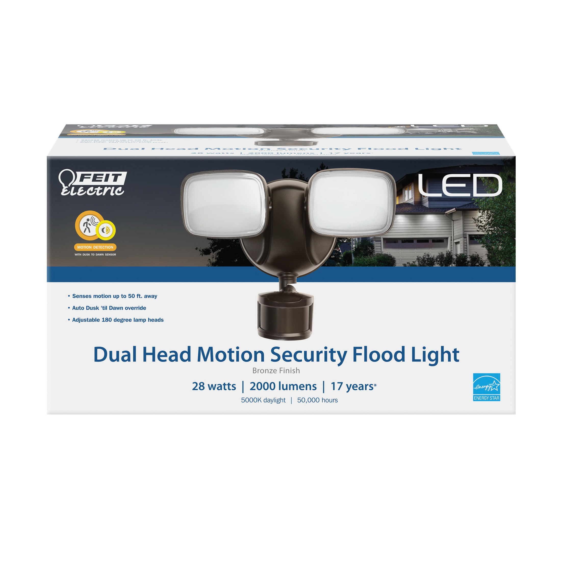 Keep your home safe and secure with the Feit Electric S9DFL/850/MOT/BZ motion-sensing dual-head LED flood light. Integrated sensors turn lights on automatically on at dusk and when detecting motion from up to 50 ft away. Rugged weather-resistant housing stands up to the elements while twin extra-bright lamps keep the surrounding area well-lit with 2000 Lumens of 5000K daylight. Great for outdoor use as a preventative measure against trespassers or indoor as an easy hands-free way to light up a space as you walk by.