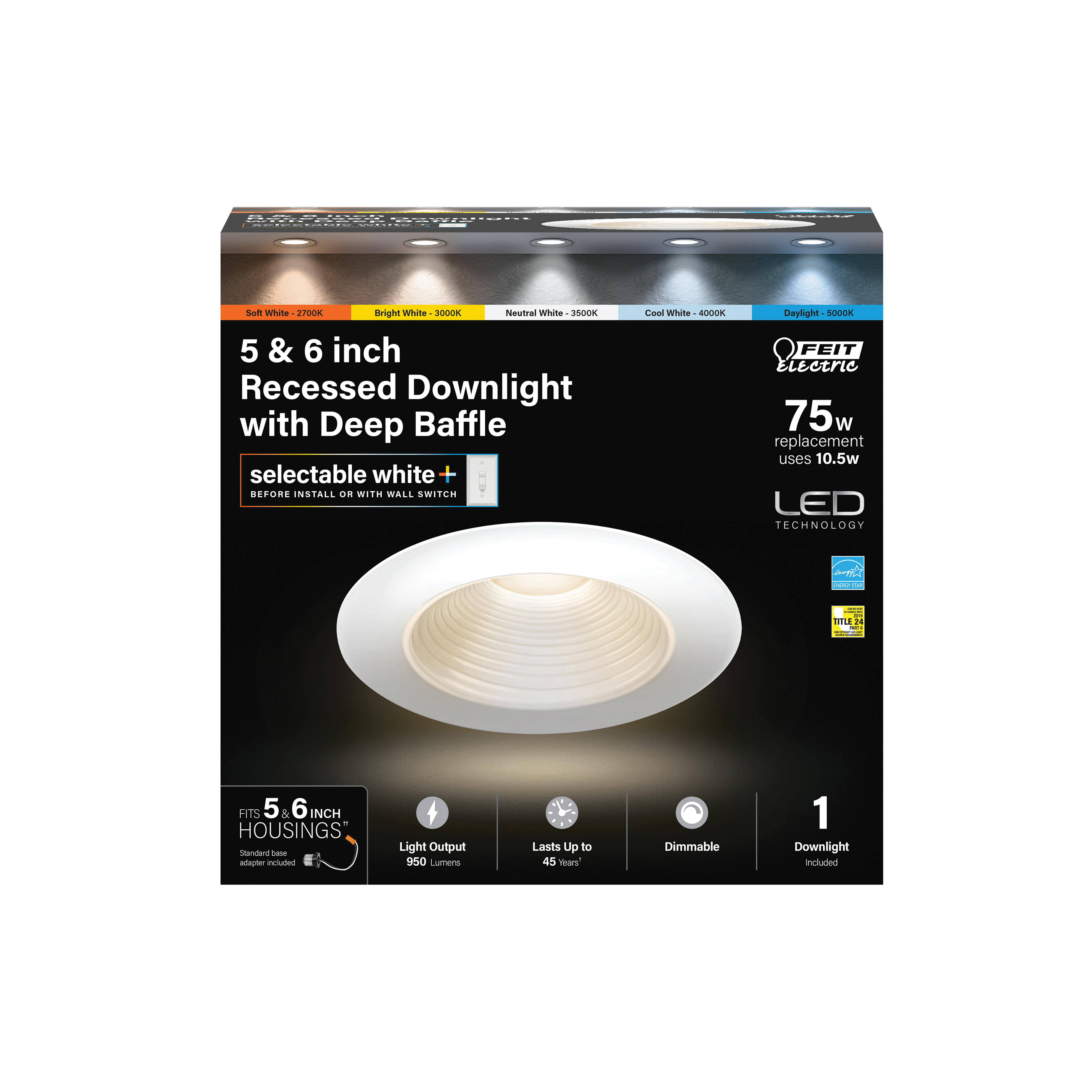 Convert your old recessed downlights to advanced LED energy saving technology with the LEDR6DB/6WYCA color-selectable 6 in recessed downlight from Feit Electric. Designed for easy DIY installation, the downlight fits most 5/6 in recessed can housings and comes with a standard base adapter and a pre-mounted trim. A deep baffle design produces extra soft light and reduces glare. Integrated LED output 950 Lumens using only 10.5 W - up to 86% less energy than an equivalent 75 W incandescent. Preset your preferred color temperature on the fixture or adjust after install with a toggle of a standard wall switch - get warm, cool or daylight color light with just a flip. A 90+ CRI light makes colors vibrant and skin tones look more natural, all while saving energy and lasting for a decade or more.