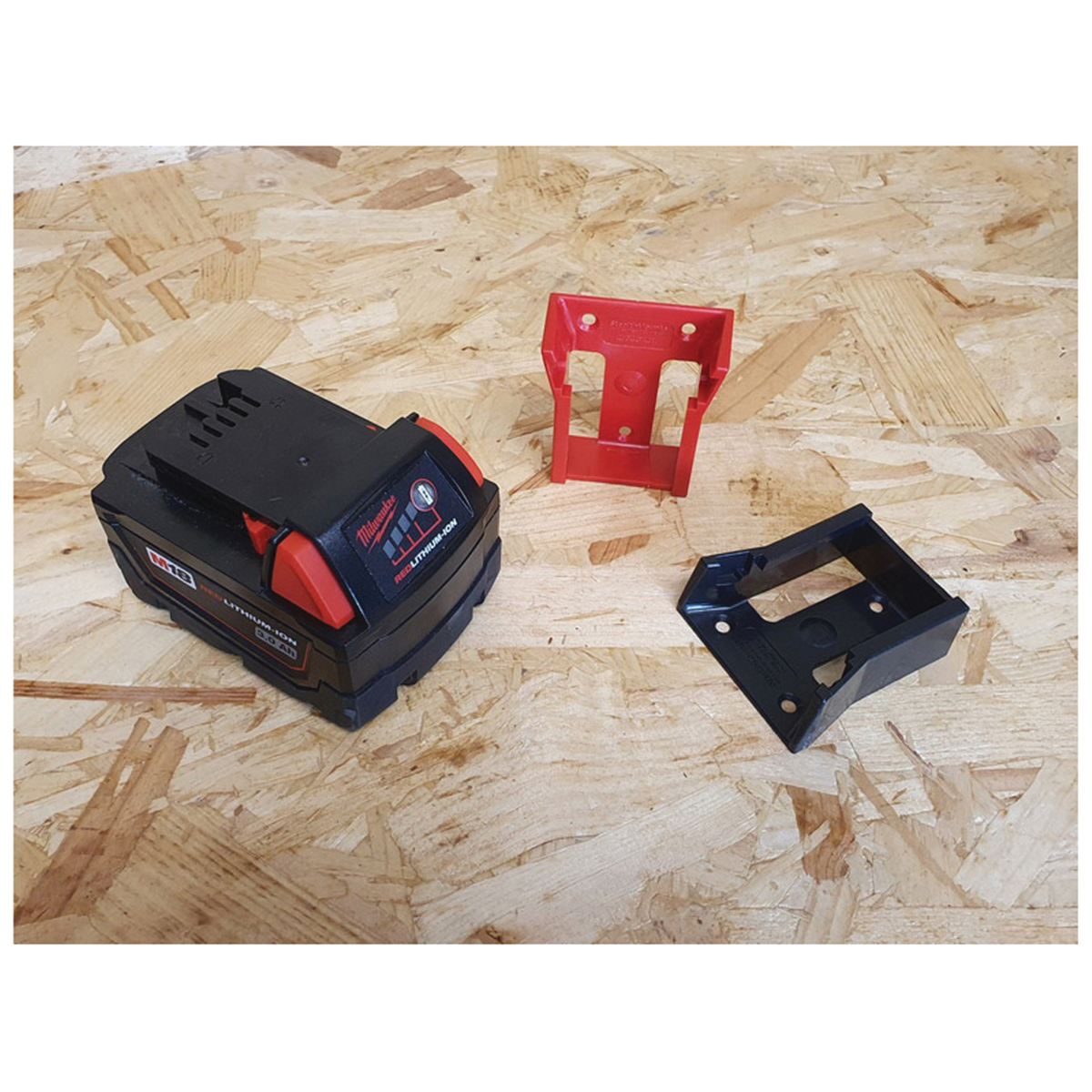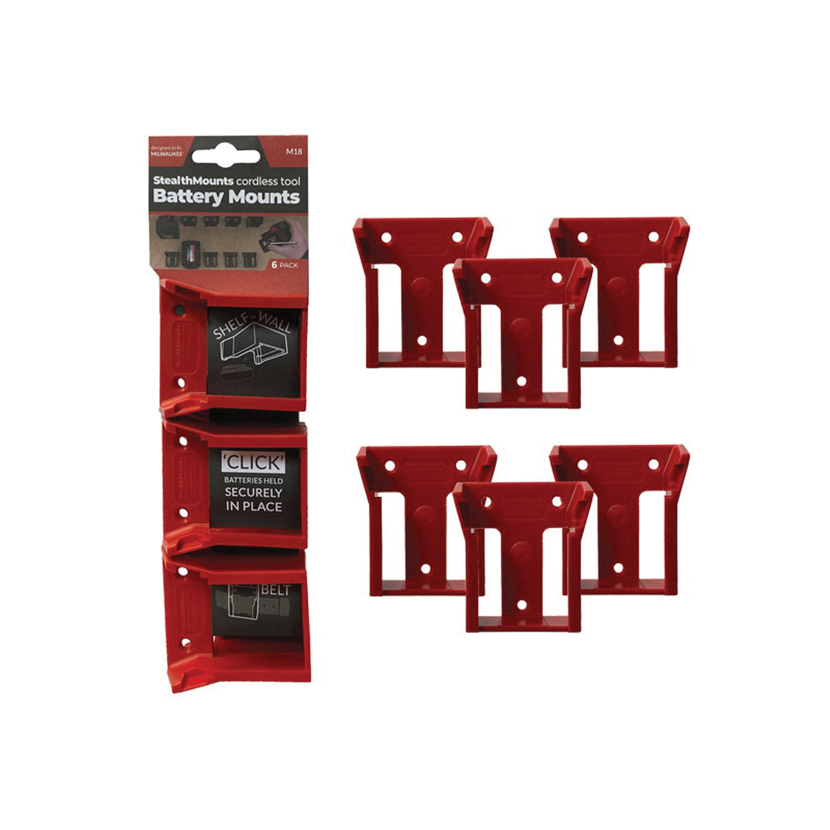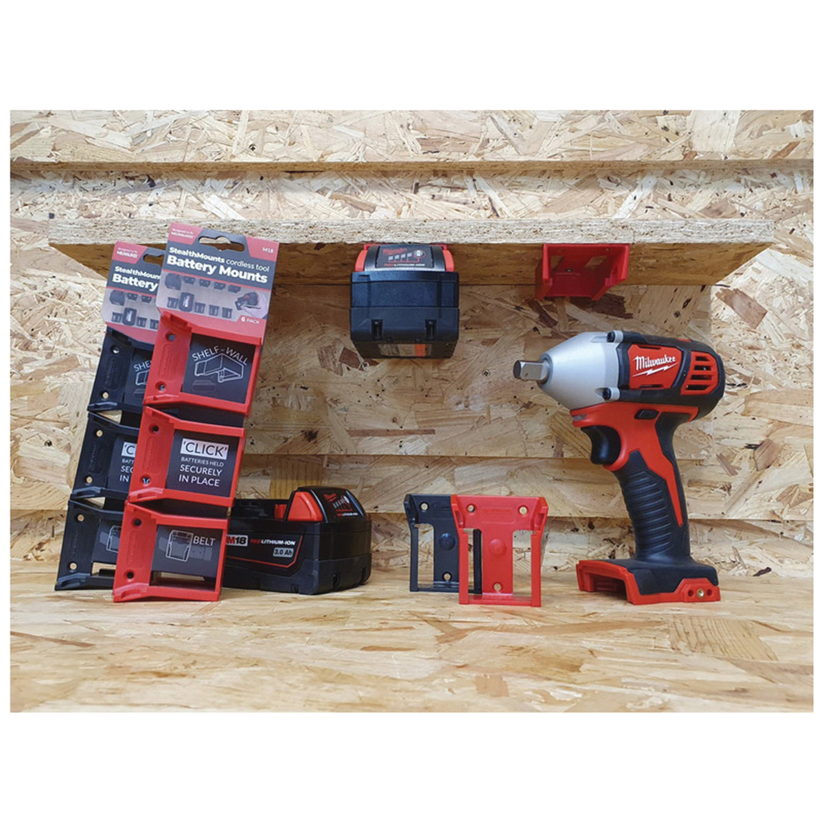 StealthMounts battery mounts for MILWAUKEE® M18 cordless batteries. Keep your batteries organized and right where you need them. Made from strong injection molded ABS plastic with holes for mounting. Batteries click into place and can be held at any angle. Can be mounted at varying distance from one another and in very small spaces for maximum workshop efficiency.