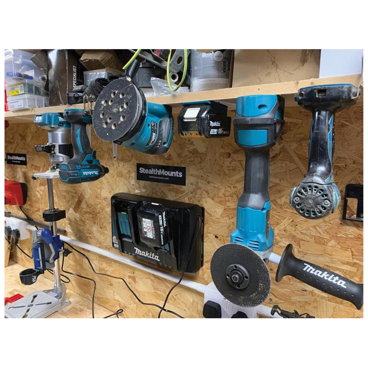 StealthMounts tool mounts for Makita LXT® cordless tools. Keep your tools organized and right where you need them. Made from strong injection molded ABS plastic with holes for mounting. Can be mounted at varying distance from one another and in very small spaces for maximum workshop efficiency.