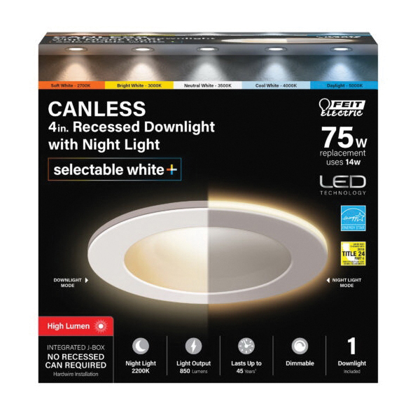 Convert your old recessed downlights to advanced LED energy saving technology with the LEDR4XT/HO/NL/5CCTCA color selectable 4 in canless recessed downlight from Feit Electric. This innovative recessed downlight features five selectable color temperatures and a 2200 K warm color night light option. Each downlight comes with a tethered J-box and built-in trim for installation directly into finished ceilings without recessed cans. A dimmable LED design produces 850 Lumens using only 14 W up to 81% less energy than an equivalent 75 W incandescent. Preset your preferred color temperature using the toggle on the fixture and go from regular lighting to night mode with just a flip of a standard light switch. A 90+ CRI light makes colors vibrant and skin tones look more natural, all while saving energy and lasting for a decade or more.