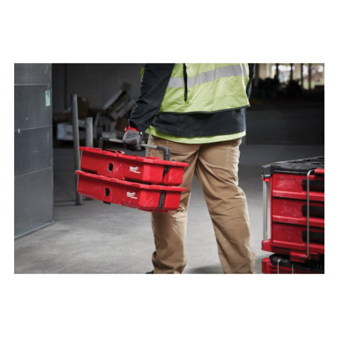 Our Packout™ tool tray features stack or Store functionality. Stack the tool tray onto any Packout™ solution, or store within the Packout™ rolling tool chest, rolling tool box, XL tool box, or the large tool box. This tool storage tray allows you to customize its internal layout with quick-adjust dividers creating up to six separate storage compartments. A 25 lb weight capacity and the metal reinforced handle enable you to easily transport tools and materials around the jobsite. Milwaukee® Packout™ is the industry's most durable and versatile storage system.