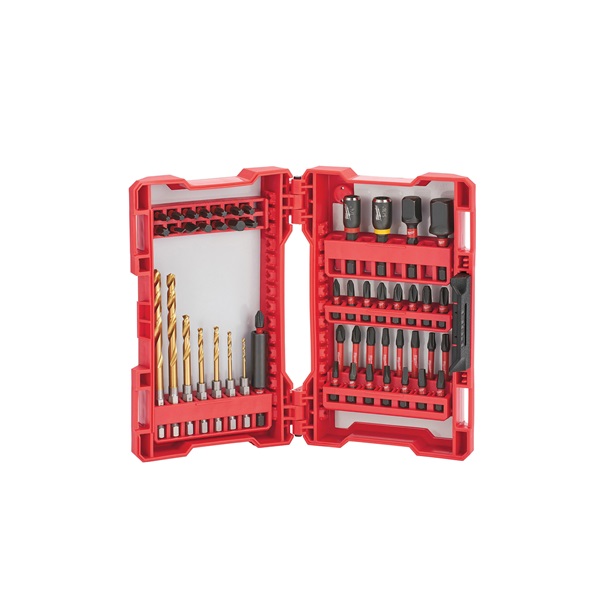 Includes | : | (1) 1/16 in Titanium Red Helix Bit, (1) 1/2 in Socket Adapter, (1) 1/4 in Hex Insert Bit, (1) 1/4 in Magnetic Nut Driver, (1) 3/16 in Hex Insert Bit, (1) 3/16 in Titanium Red Helix Bit, (1) 3/32 in Titanium Red Helix Bit, (1) 3/8 in Socket Adapter, (1) 5/16 in Magnetic Nut Driver, (1) 7/32 in Titanium Red Helix Bit, (1) 1/4 in Titanium Red Helix Bit, (1) Carrying Case, (1) Compact Bit Holder, (1) PH1 Insert Bit, (1) PH3 2 in Bit, (1) SL#10 Bit, (1) SL#6 Bit, (1) SQ1 Insert Bit, (1) SQ3 2 in Bits, (1) T15 Insert Bit, (1) T20 2 in Bit, (1) T25 2 in Bit, (1) T30 Insert Bit, (2) 1/8 in Titanium Red Helix Bits, (2) PH2 2 in Bits, (2) PH3 Insert Bits, (2) Phillips Recessed Insert Bits, (2) SQ2 2 in Bits, (2) T20 Insert Bits, (3) SQ3 Insert Bits, (4) PH2 Insert Bits, (4) SQ2 Insert Bits, (5) T25 Insert Bits |