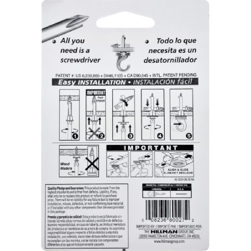 Hillman driller hook ceiling hooks combine the unique design of a 360 deg swivel hook with the added security of a steel anchor. While drilling to steel anchor locks upright during installation providing a more secure hold than traditional hangers. Use in drywall, wood or brick.