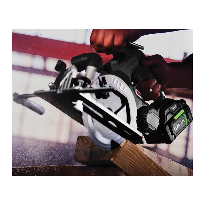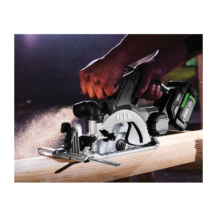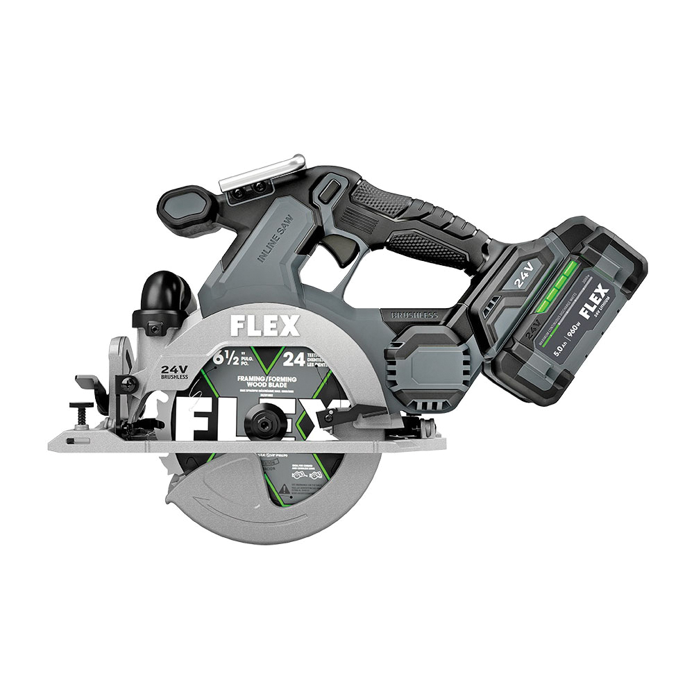 First of its kind, this in-line saw design provides total balance and improved visibility with a clear view on both sides of every cut. The Flex 24 V brushless 6-1/2 in in-line circular saw rips through 3X in one-pass. The built-in LED illuminates the workpiece for excellent precision and accuracy. This advanced saw also features the Flex advantage, unmatched Flex 24 V battery power, extended runtime and fast-charging.