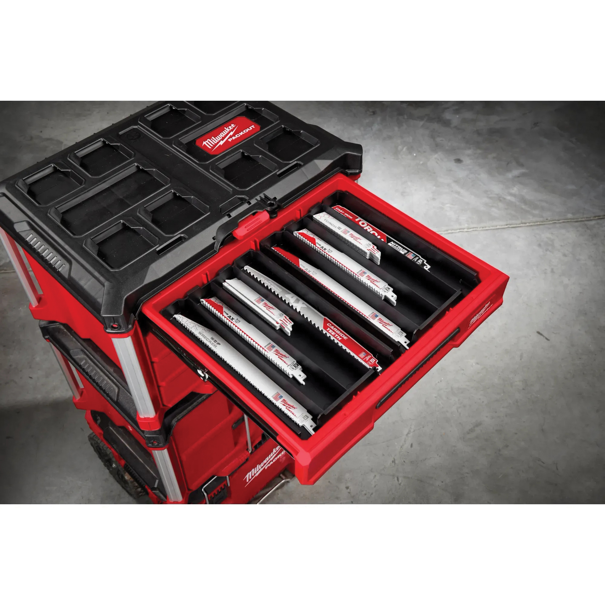 Our 15PC SAWZALL blade kit with PACKOUT low-profile compact organizer includes a removable storage tray with the capacity to store up to 12 in L SAWZALL blades. This kit features (15) high-performing SAWZALL blades. This kit includes the AX with carbide teeth for pruning and clean wood is designed for the fastest above and below-ground cutting applications. The AX blades for wood applications feature NAIL GUARD to protect your blade's teeth from fracturing during cutting while the FANG TIP feature allows you to easily perform plunge cuts. The WRECKER has the capability of cutting nail-embedded wood, plastics and a variety of metals. The TORCH blades for metal applications feature TOUGH NECK ribs that strengthen your blade's tang and minimize breakage. The reciprocating saw blades in the set are ideal for a variety of root removal and wood and metal applications.