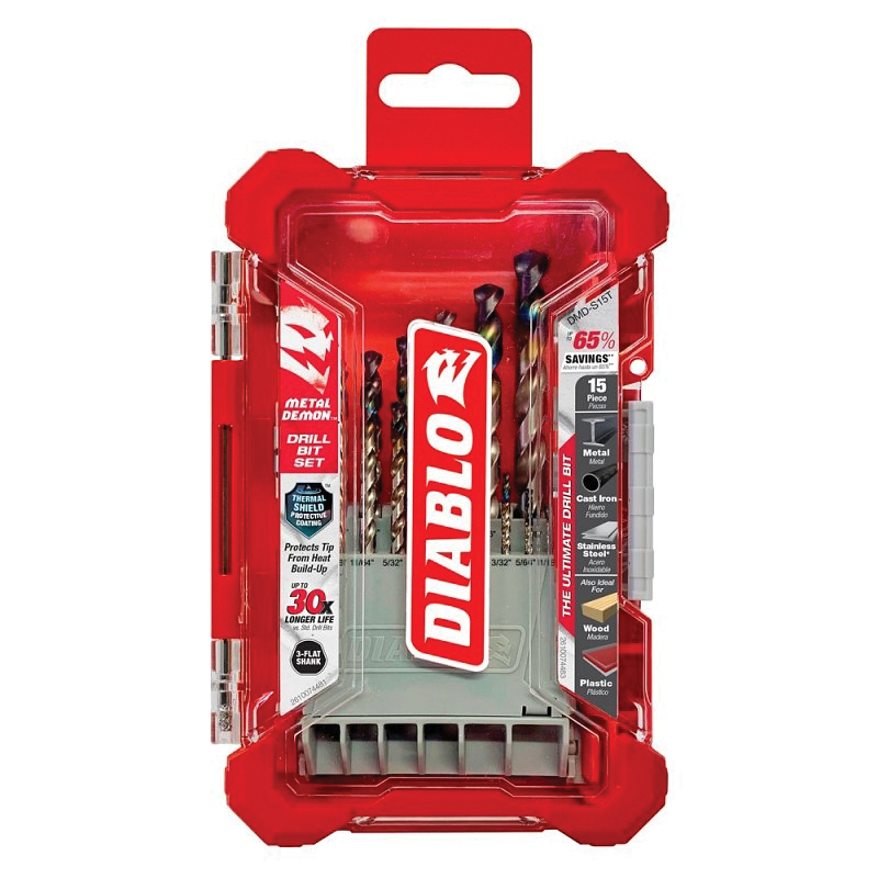 Diablo's Metal Demon™ drill bits redefining metal drilling by eliminating the need to carry multiple types of bits as the Metal Demon™ range's exclusive design delivers maximum durability, great performance, longer life in mild, hardened and stainless steels. This ultimate drill bit delivers up to 30X longer life when compared to standard drill bits. A 130 deg hybrid split point tip design enables fast, on-point starts. Diablo's proprietary thermal Shield Protective Coating™ creates a multi-layered protective barrier around the tip to shield against heat, increase life and maximize durability. An automated precision CNC grinding process ensures strict industrial standard angle tolerances to minimize bit wear and enable faster drilling. The optimized flute design removes metal debris faster, keeping the tip cooler for ultimate strength and durability in all metal drilling applications.