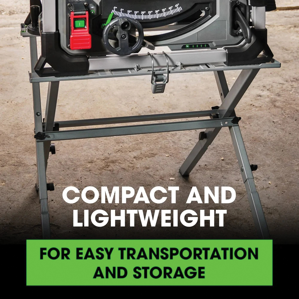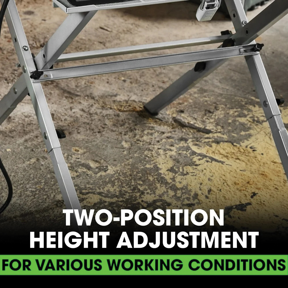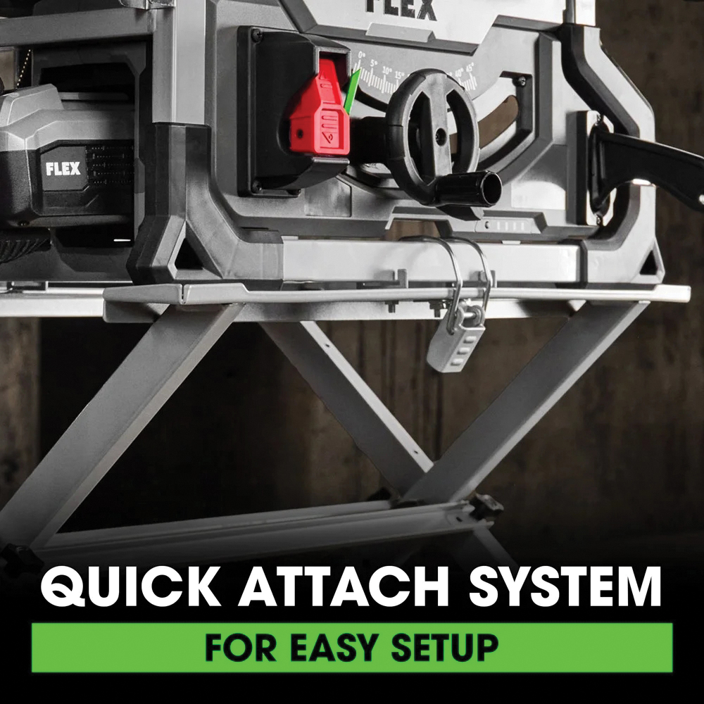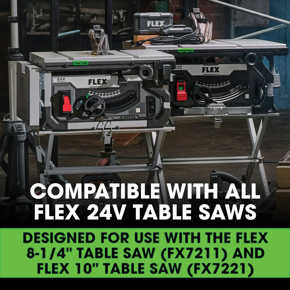 Confidently cut with your FLEX® table saw on the jobsite using the FLEX® folding table saw stand. Compatible with all FLEX® 24 V table aaws including the 8-1/4 in table saw (FX7211) and 10 in table saw (FX7221), the folding table saw stand features a quick attach system for fast, easy setup. It's compact, lightweight design makes this folding table saw stand easy to travel with to, from and around the jobsite. It features a two-point height adjustment for various working conditions. A 100 lb maximum load capacity easily supports your table saw and cutting materials.