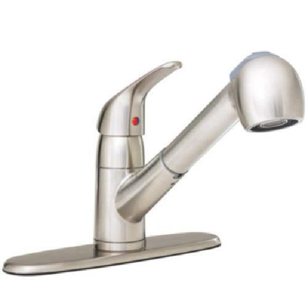 Proflo Pull-Out Kitchen Faucet, 1/2-14 Connection, NPSM Connection, 1.5 gpm, Deck Plate Size: 10 in W, Spout Reach: 8-3/4 in, Spout Height: 7-9/16 in, Lever Handle, Number of Faucet Handles: 1, Brass, Brushed Nickel, Deck Mounting, Number of Faucet Holes: 1, 3, Dimensions: 10 11/16 in W X 7-5/8 in H, Includes: Escutcheon, Handle