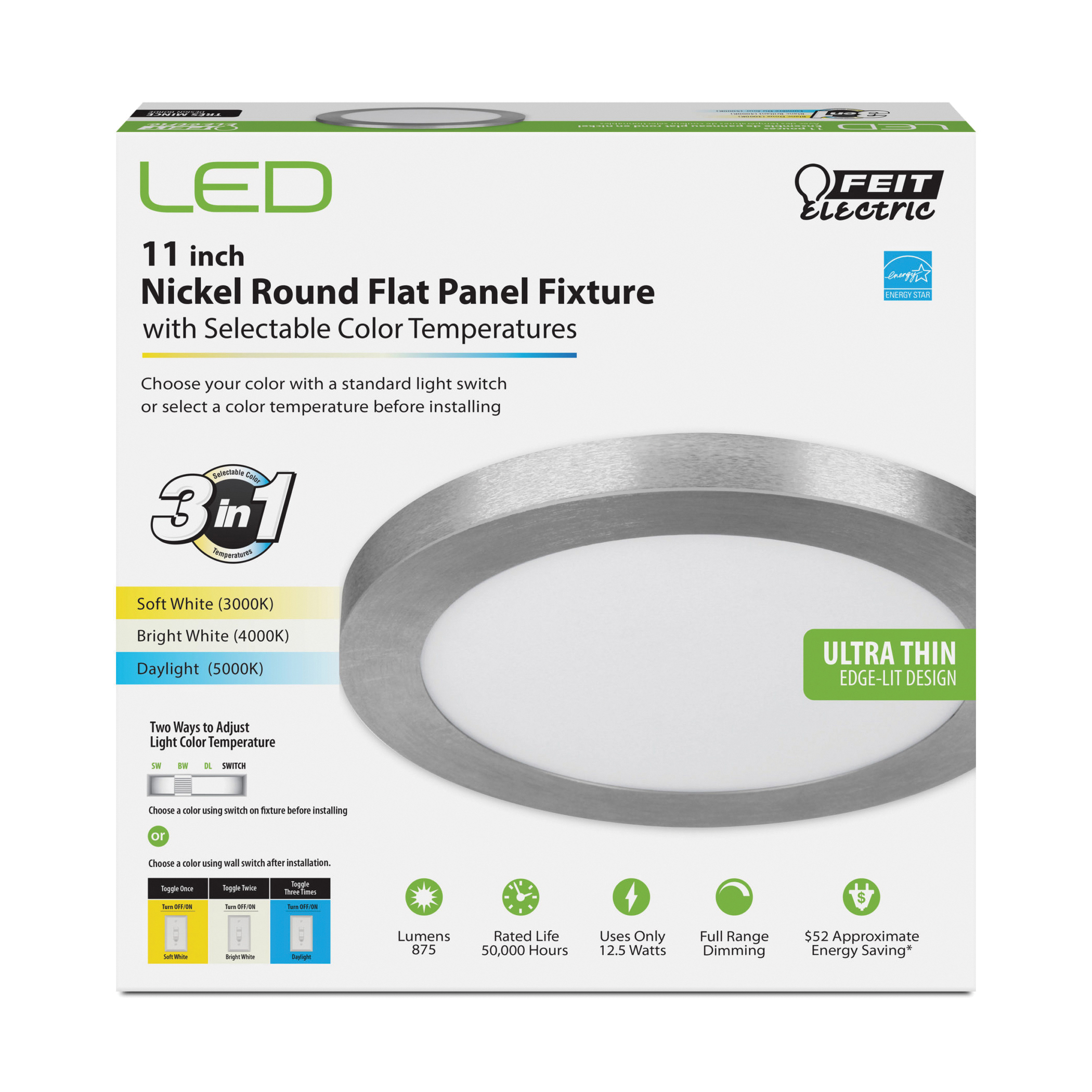 Add function and beauty to any residential or commercial area with the Feit Electric FP11/4WY/NK 11 in round flat panel ceiling fixture. Use the switch on the back of the fixture to adjust color temperature to meet your needs. Toggle once for warm white, twice for bright white and three times for daylight. An ultra slim, edge-lit design with white polycarbonate lens and nickel trim finish are complemented by energy-efficient, long-lasting integrated LEDs, with no bulbs to replace. Feit Electric ceiling fixtures/wall sconces are energy efficient, producing even light distribution and lasting an average of 50,000 hrs/45.7 years or more.
