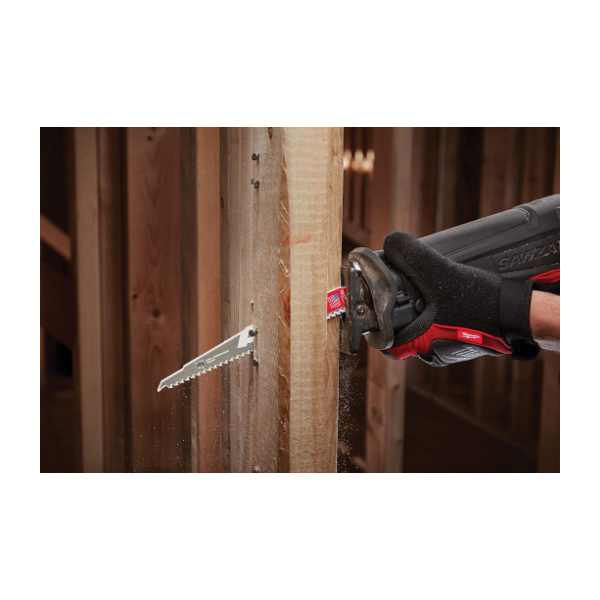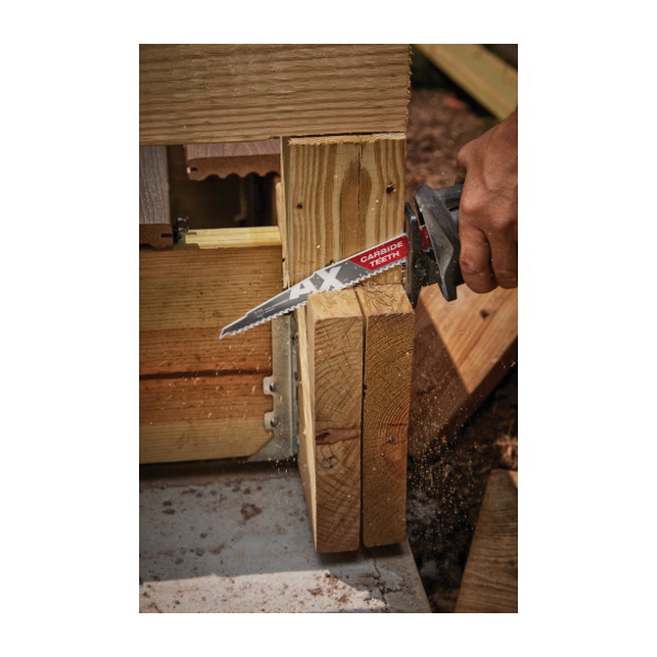 We engineered The AX™ with carbide teeth to deliver extreme blade life and unmatched versatility. This SAWZALL® blade is the best solution for wood and nail embedded wood cutting applications. The AX™ delivers up to 50X life over standard recip saw blades. The heavy-duty blade cuts through a wide variety of materials including nail-embedded wood, durlock, plaster and shingles. Each blade tooth has 25% more carbide than leading carbide competitors and feature Nail Guard™ to rip nails without ripping teeth. Optimized tooth design ensures The AX™ blades deliver extreme life in wood cutting applications.