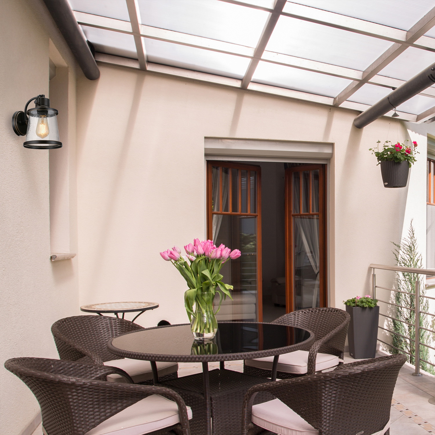 globe Wall Sconce, Lamp Wattage: 60 W, Number of Lamps: 1, Lamp Type: LED, Lamp Base: E26 Medium, Average Life: 15000 hr, Color Temperature: 2200 K, Lumens: 469 Lumens, Light Color: Soft White, Shade Type: Seeded, Shade Material: Glass, Shade Color: Clear, Fixture Finish: Oil-Rubbed Bronze, Dimensions: 8.3 in W x 9.5 in H, Includes: Mounting Hardware, Bulb
